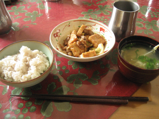 昼:キャベツと豚肉の味噌炒め、かきたま汁