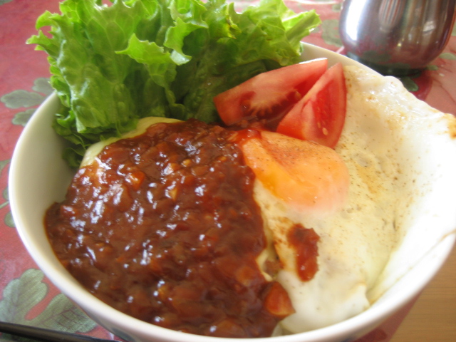 半日で学校は終わったので、お昼はちょっと豪勢に昨日食べたハンバーグの残りの種でロコモコをつくりましたよー。ドン!