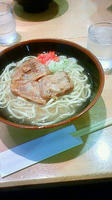 帰る日に、平和通り(本市場通りかも)で食べた二杯目(¥450)は麺が柔らかかった。ちゃんぽん麺よりちょっとコシが強いくらいでした。これがまたスープが旨いの……。惚れたよ、大将!(しかもおまけでサーターアンダギーまでつけてくれた!下町風の店は好き)